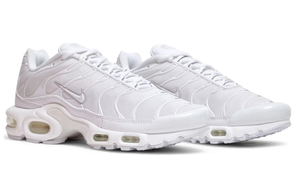 The Nike Air Max Plus Triple White undulates with style as it provides visible cushioning, support, and traction.