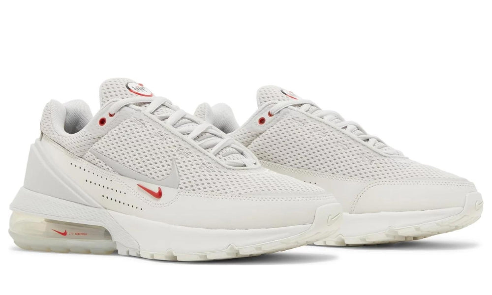 The Triple White colorway of the Nike Air Max Plus features tonal wavy lines embroidered into the Soft White tumbled leather upper. Matching white overlays cover the mudguard and the heel, and the side panel Swoosh is embroidered, complementing the wavy lines. White laces cross over a white mesh tongue, which matches the white mesh sock liner. The white rubber outsole features rectangular traction pads and grooved ridges, along with Tuned Air branding. Tuned Air branding also provides as a hit of color on the heel.